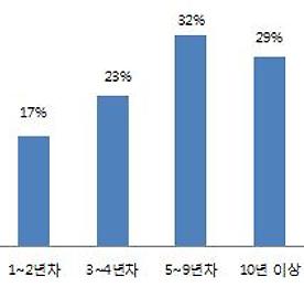 그렇다 보니, 이직 경험도 잦았다. 지금까지 몇 회 정도 이직을 경험했느냐는 질문에 대해, 이직 경험이 아예 없다는 응답은 20%에 채 미치지 못 했다. 5회 이상 이직 경험이 있다는 응답이 21.7%에 달했다.