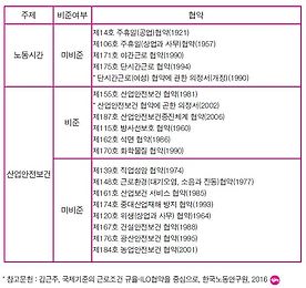 이어서 다음 과제로, 국제노동기구(ILO)의 협약 중 노동자 건강과 관련된 협약들을 살펴보고자 한다. 현 정부에서는 ILO의 4개 핵심협약 △결사의 자유(87, 98호) △강제노동 철폐(29, 105호) 등을 비준하겠다고 밝힌 바 있고, 최근에는 UN에 구체적 의사를 전달하기도 했다. 환영할만한 소식이지만 아직 갈 길이 멀다.