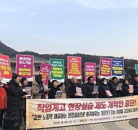 교육부는 ‘산업체 현장실습 참여 기피’, ‘조기취업 기회 단절에 따른 고졸 취업률 하락’을 이유로 안전과 교육을 포기하고 있다. 교육부는 1월 17일 ‘직업계고 현장실습 보완 방안 마련’을 위한 국회 공청회에서 산업체가 ‘안전사고 부담’과 ‘관리 부담’, ‘늦은 채용’으로 현장실습을 기피하기 때문에 ‘보완’해야 한다고 했다. 이는 ‘직업계고 현장실습이 교육 목적보다는 저임금 노동력 활용’으로 변질되어 ‘조기취업형 현장실습’을 폐지하고 ‘학습중심 현장실습’으로 가려던 방향을 바꾸는 것이다. 산업체가 기피하는 것은 학습중심 현장실습이 가능한 기업이 극소수이고, 그간 현장실습이 무분별하게 이뤄졌다는 것을 방증하는 것이다. 우리는 교육부가 교육과정 운영을 중심으로 현장실습을 고민하지 않고 기업 요구 중심으로 판단하고 정책을 뒤집는 현실에 깊이 우려한다. 시행 1년도 안 되어 방향을 바꾸고, 기업의 ‘늦은 채용’을 걱정하는 것은 교육부가 교육을 포기하는 것이다. 교육부는 기업의 요구대로 학생을 일찌감치 ‘저임금 노동력’으로 내어줄 방안에 골몰할 것이 아니라 학생에게 필요한 훈련체계가 무엇이고, 어떻게 만들어 지원할 것인지 고민한 결과를 내놓아야 한다.