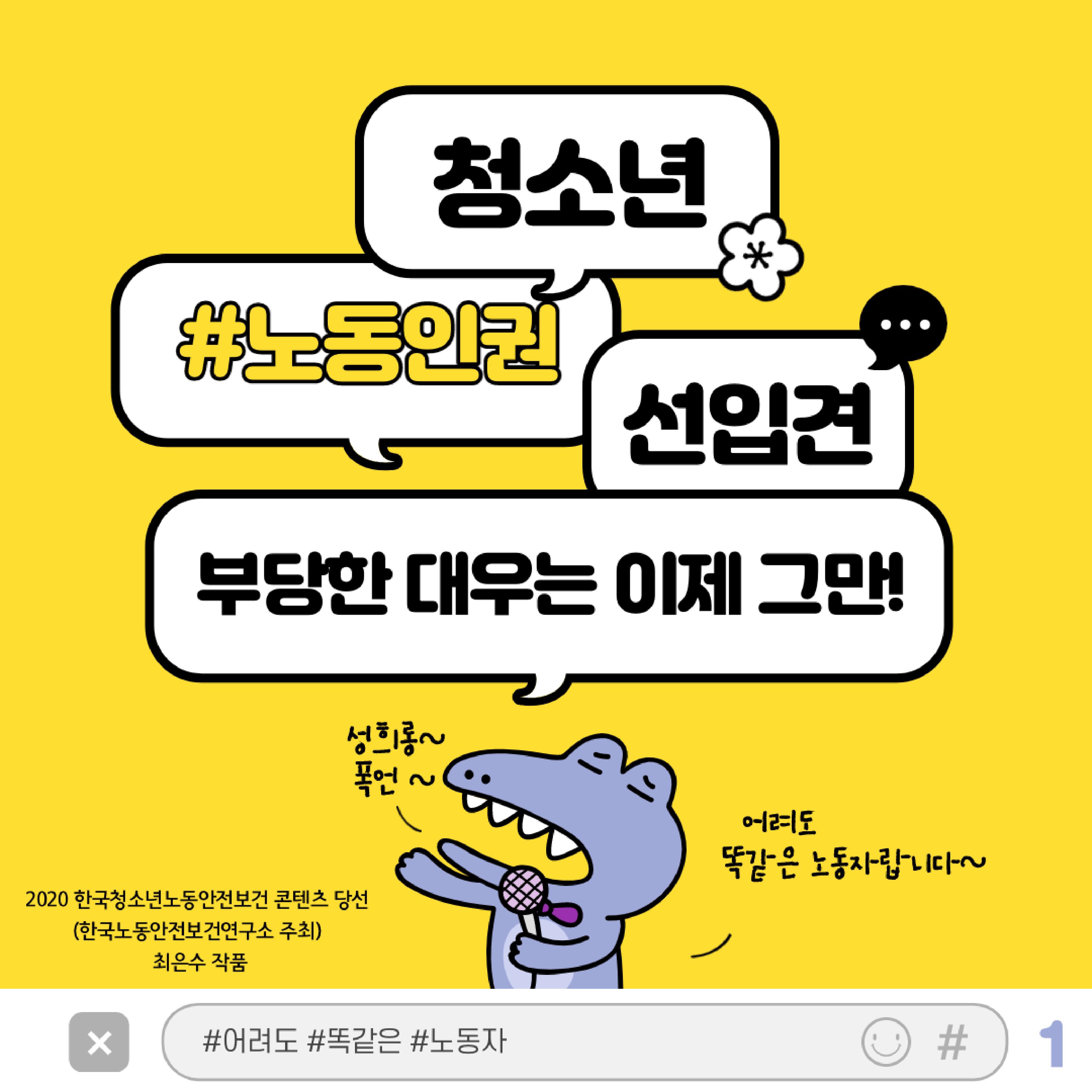 | [공모전 작품] 이샛별 <청소년, 알바를 하려면> 카드뉴스 - 2020 청소년노동안전보건 콘텐츠 공모전 시상 작품 ② (0) | 2020.02.19 |