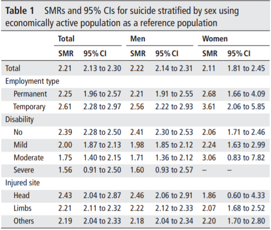 산재 노동자는 고용형태, 장해 정도, 손상 부위에 관계없이 대부분 전체 경제활동인구에 비해 자살 사망률이 통계적으로 유의하게 높았다. 사고 당시 임시직에 종사한 노동자는 상용직보다 자살 사망률이 더 높게 나타났다. 이러한 결과는 산재 사고로 인한 소득 손실, 실직, 직장 복귀의 어려움이 임시직에서 더 크다는 이전의 연구들을 반영한다.
