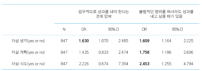 둘째, ‘성과 압박’은 사무금융 노동자의 특징적인 위험 요소로 확인됐다. 노동강도를 강화시키는 요인에서 가장 많은 빈도를 보인 것은 “영업·업무 성과에 대한 압박”이었고, ‘업무적으로 성과를 내야 한다는 것에 압박을 느낀다’는 항목에서 80% 이상, ‘불법적인 행위를 해서라도 성과를 내고 싶을 때가 있는가’라는 항목에는 26.4%가 ‘있었다’고 답했다. 또한 성과 압박과 자살 간의 상관분석을 통해 성과 압박이 자살이라는 위험도 높은 상태와 관련성이 높게 나타났다.