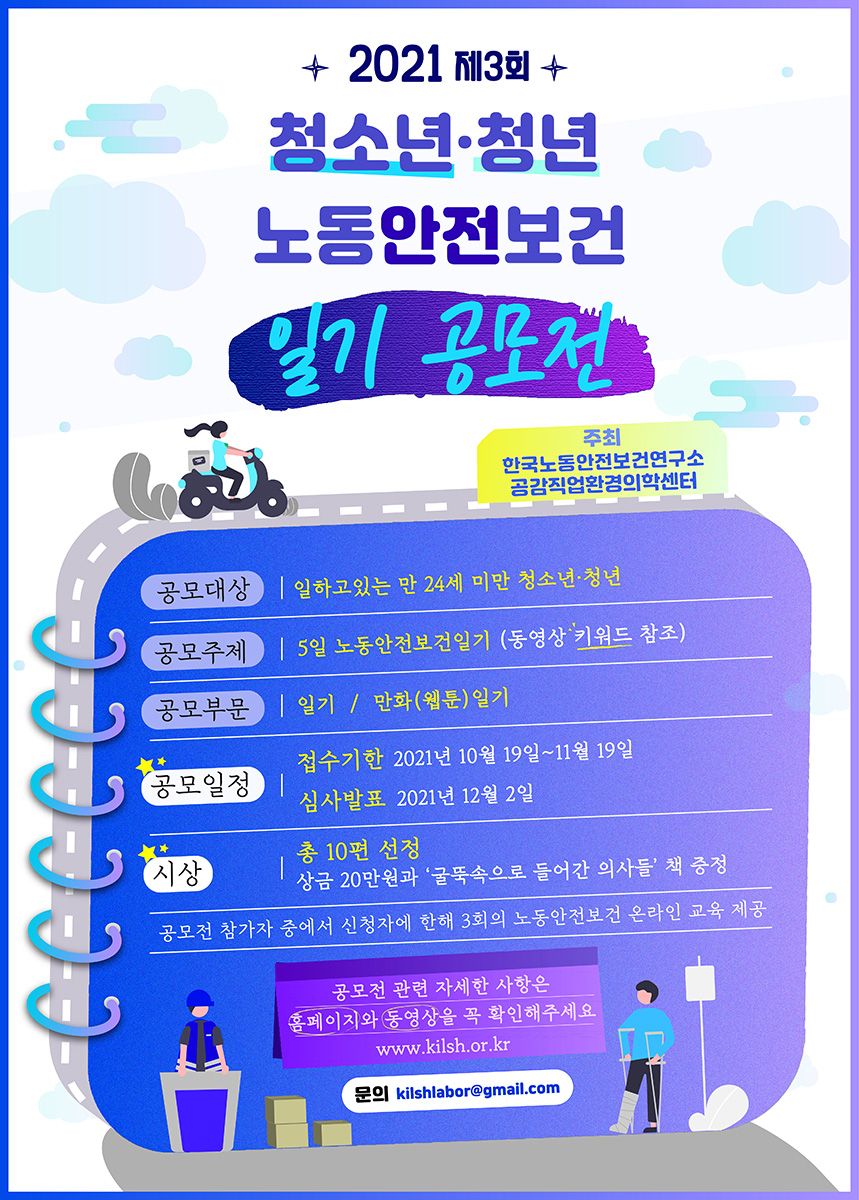 한국노동안전보건연구소와 공감직업환경의학센터가 함께 주최하는 ‘2021 제3회 청소년.청년 노동안전보건 일기’ 공모전은 청소년,청년 노동자가 경험하는 일터의 다양한 위험에 주목합니다. 많은 청소년.청년 노동자가 학교에 다니면서 아르바이트를 하고, 특히 직업계고등학교를 졸업한 청소년은 취업을 하는 경우도 많습니다. 이러한 과정에서 청소년.청년 노동자가 일을 하다가 다치거나 심지어 사망하기도 합니다. 이번 공모전을 통해 청소년.청년 노동자의 노동안전보건 감수성을 높이고, 일터에서의 자기 경험을 직접 이야기해보고 해결방안을 함께 모색해보고자 합니다.
