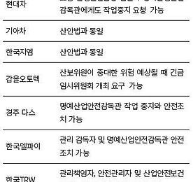 산업안전보건법은 작업 중지 이후 조치와, 작업을 재개할 조건 등에 대해서 자세하게 규정하지 않고 있다. 완성차 3사 지부는 모두 산업안전보건법과 동일하게 해당 내용이 빠져 있다. 그밖에 경주 다스, 한국델파이, 한국TRW, 현대로템, 스타케미칼 등도 마찬가지이다.