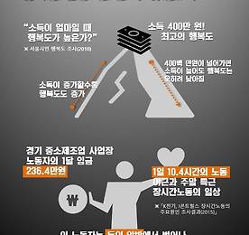 '서울시민 행복도 조사'(2010년)에서 소득이 증가 할수록 행복도도 증가하지만 400만 원이 넘어가면서부터는 소득이 늘어도 행복도는 오히려 낮아지는 것으로 나타났다. 미국의 연구결과와 달리 400만 원이 넘어가면 더 많은 소득을 만들어 내기 위해 감수해야 할 희생도 그만큼 늘어나기 때문에 오히려 행복도가 떨어졌다고 하니, 업무강도 강화나 노동의 시간 증가가 영향을 준 것이라 추측된다.